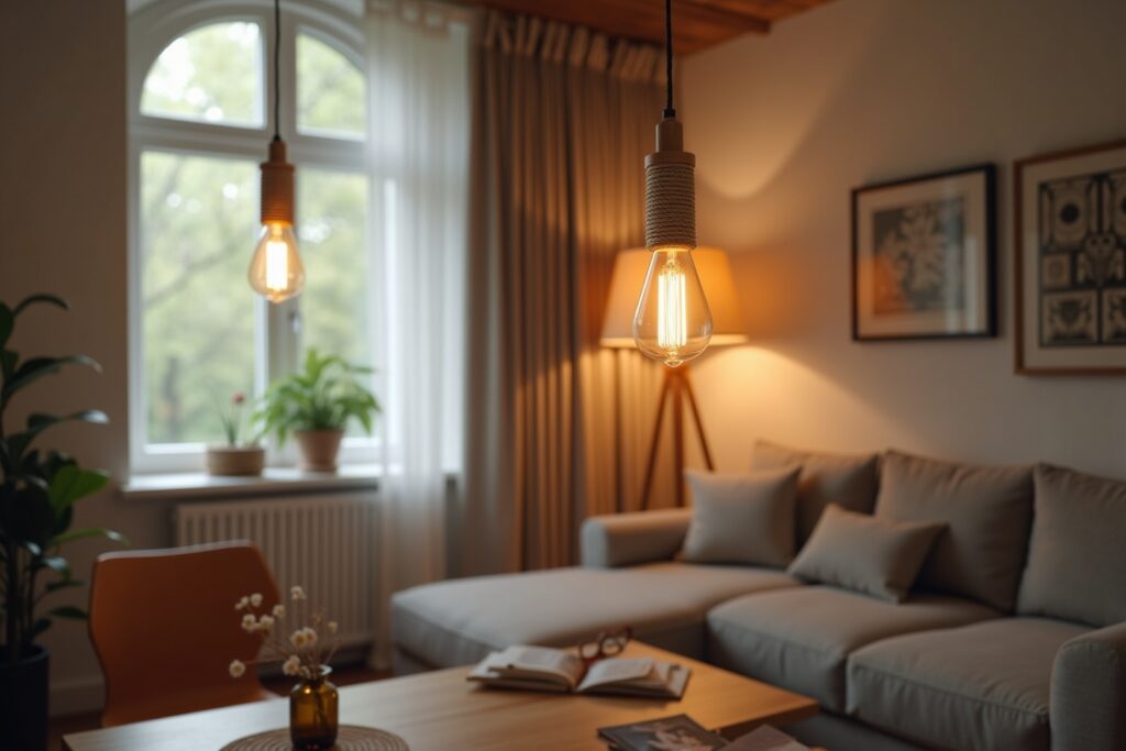 - Einzelne Hängeleuchte: Eine einzelne Hängeleuchte mit einem dekorativen Holzstück und einem eleganten Seil ist ideal, um einen bestimmten Bereich hervorzuheben.