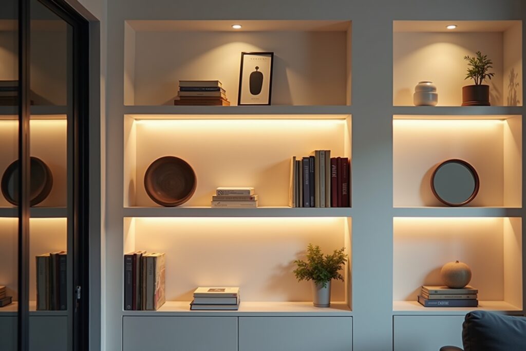 - LED-Streifen: Flexibel, energieeffizient und vielseitig einsetzbar. Sie können diskret unter einem Regalbrett montiert werden, um nach unten gerichtetes Licht zu erzeugen, oder entlang der Vorderkante für eine indirekte Beleuchtung.