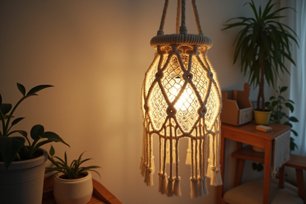 - Mit Pflanzen kombinieren: Eine Makramee-Lampe kann auch als Pflanzenhänger gestaltet werden, indem du eine Aussparung für einen Blumentopf lässt. Dies schafft ein lebendiges und natürliches Ambiente.